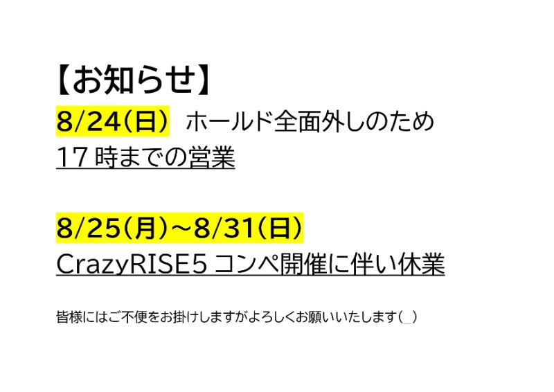 休業のお知らせ Crazy RISE 5 開催に伴い休業があります。 8/24(日) 17時までの営業 8/25(月)~8/31(日) コンペ開催のため休業 よろしくお願いいたします。 前の記事へ TOP 次の記事へ